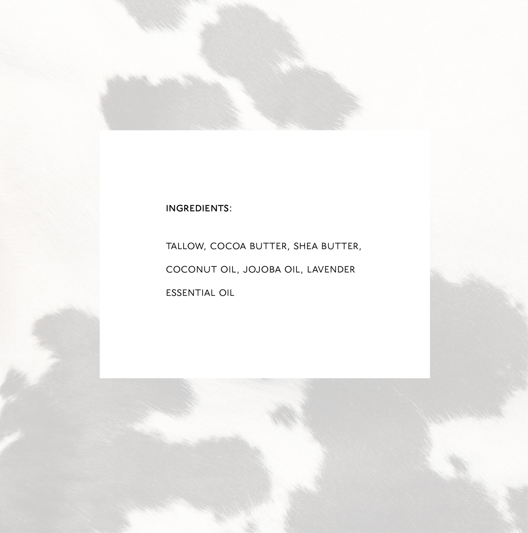 Tallow, Shea Butter, Cocoa Butter, Coconut Oil,, Jojoba Oil, Lavender Essential Oil