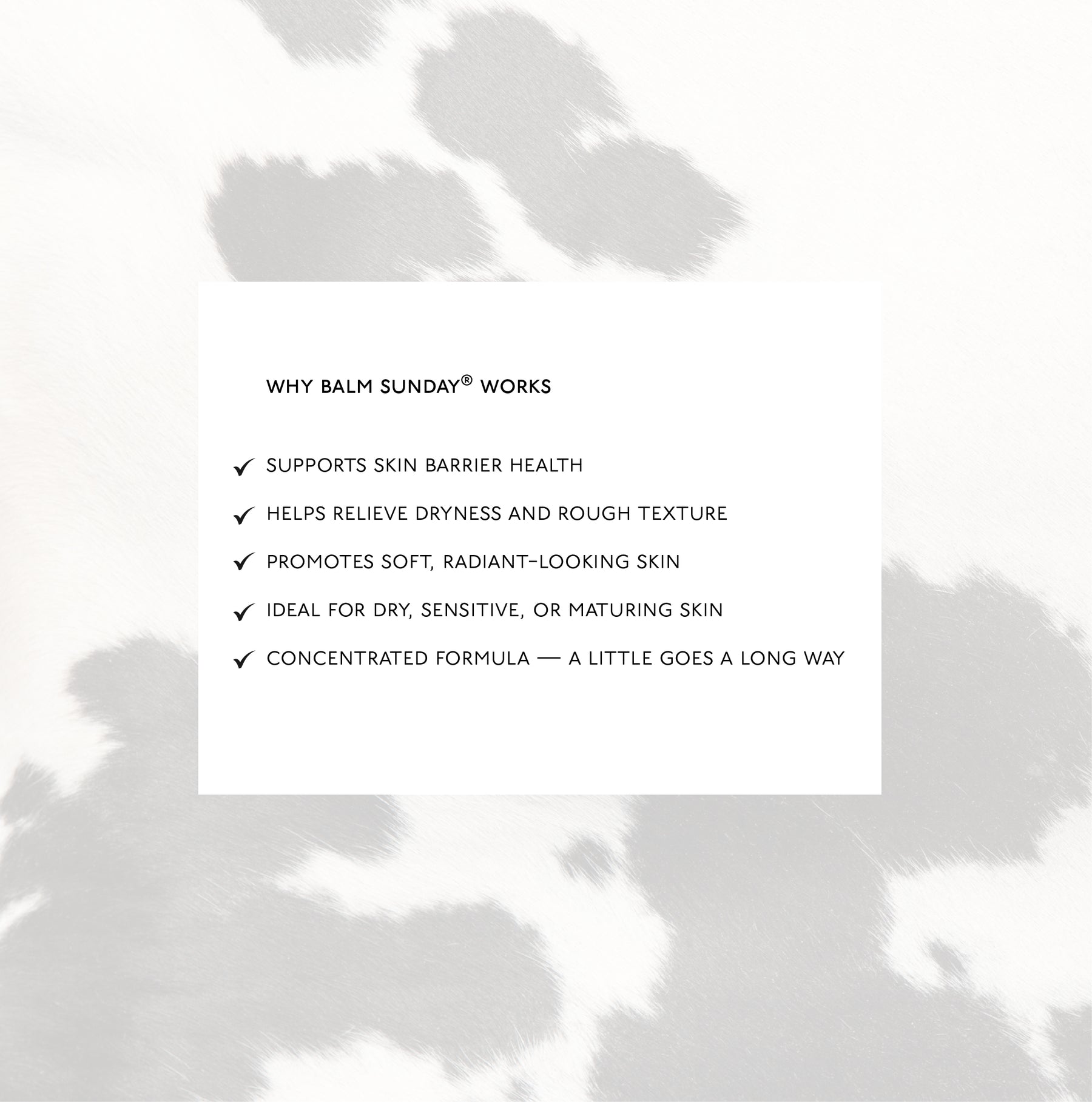 Crafted with nutrient-rich, skin-compatible tallow, BALM SUNDAY® works in harmony with your skin’s natural barrier to help replenish moisture, improve softness, and support resilient, age-defying skin. Unlike water-based lotions that sit on the surface, this concentrated balm melts in and delivers lasting nourishment where your skin needs it most.