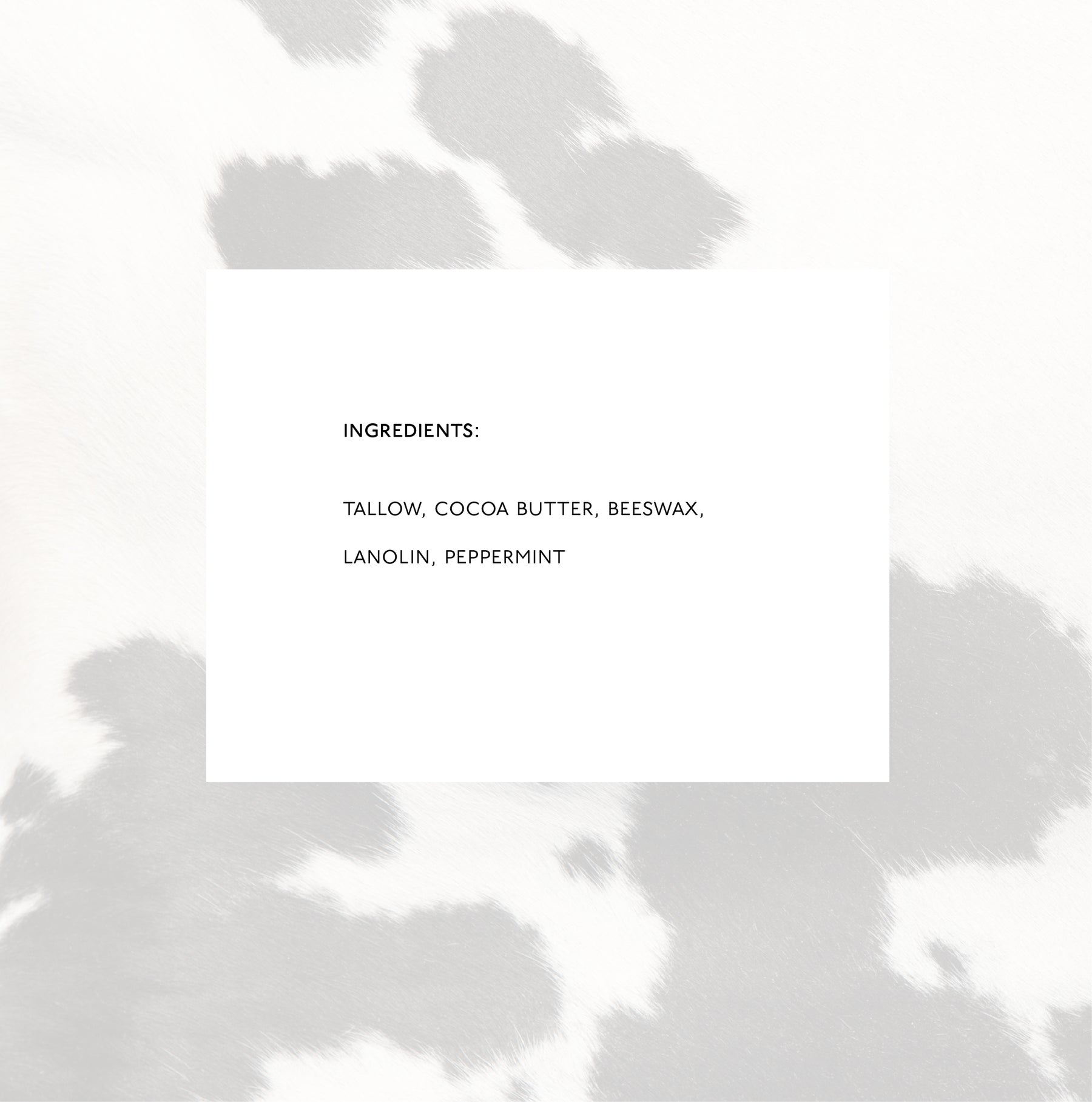 Tallow, Cocoa Butter, Beeswax, Lanolin, and Peppermint Oil.