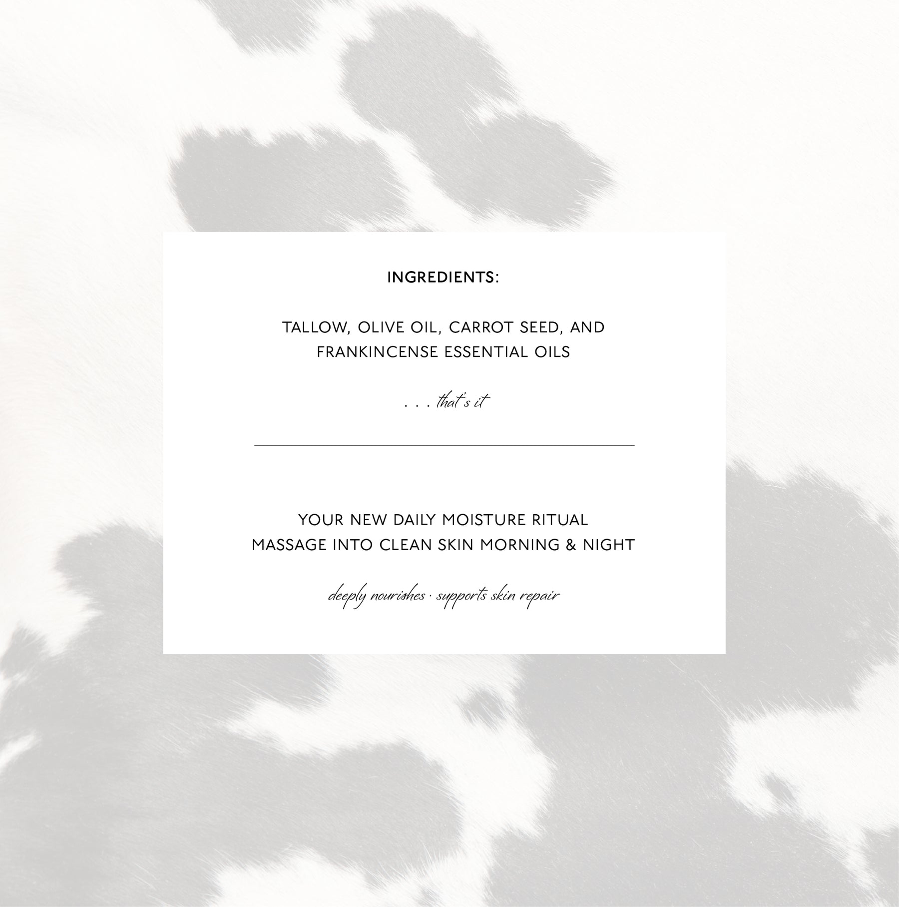 Apply a small amount of Tallow Face to clean, dry skin.
